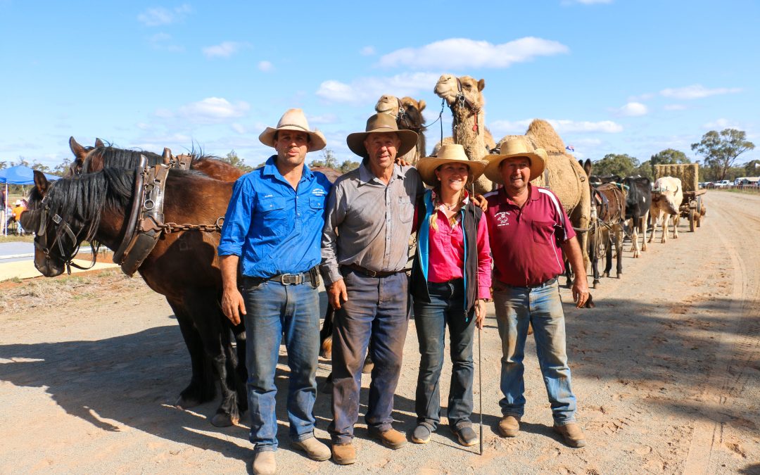 Caption: A world first – horses, camels, donkeys and bullocks – harnessed in the one team at the Good Old Days Festival with Aleks Berzins, Phil Thomson, Emily Parrott, and Rodney Sansom. Image Kim Woods